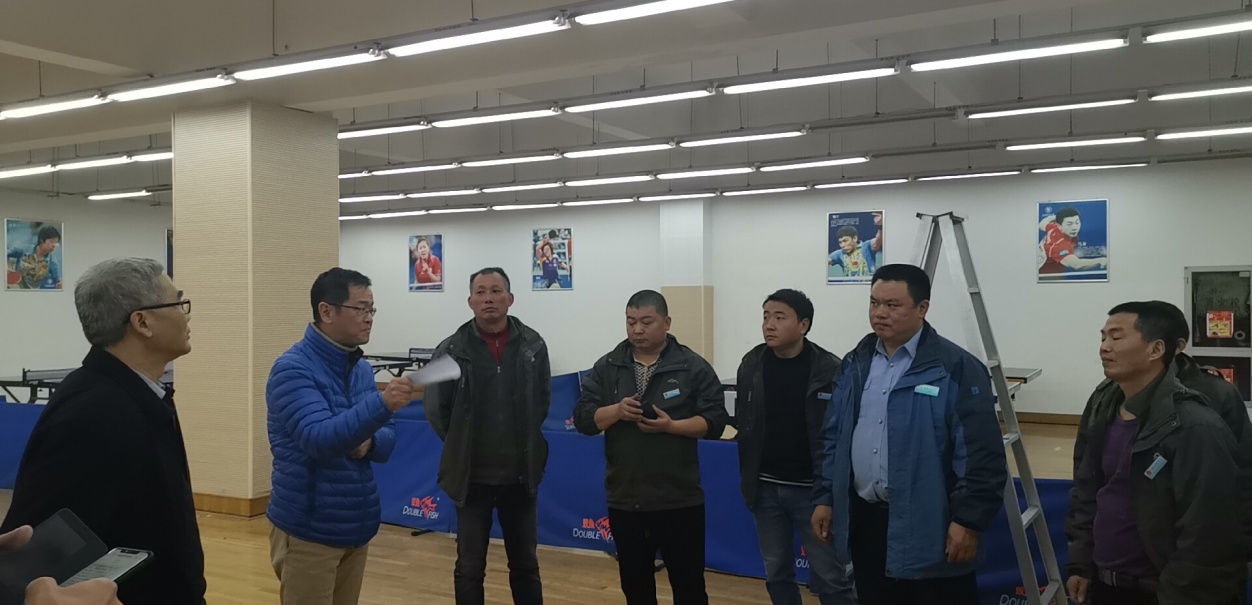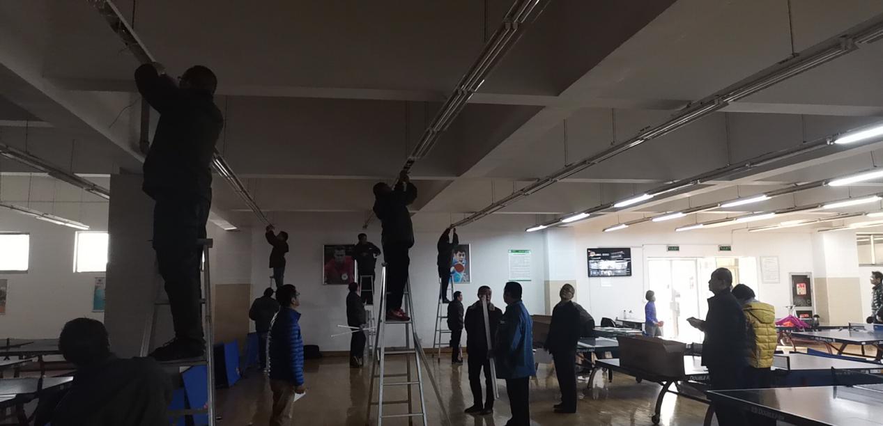 比赛在麦庐园校区体育馆乒乓球室举行,维修中心水电维修师傅全部参加比赛,项目为LED日光灯改造,每人改造5组灯具,比赛从参赛人员入场使用文明用语、维修速度、改造效果及场地清理四个方面综合评分,全程展现了维修人员日常工作情景。