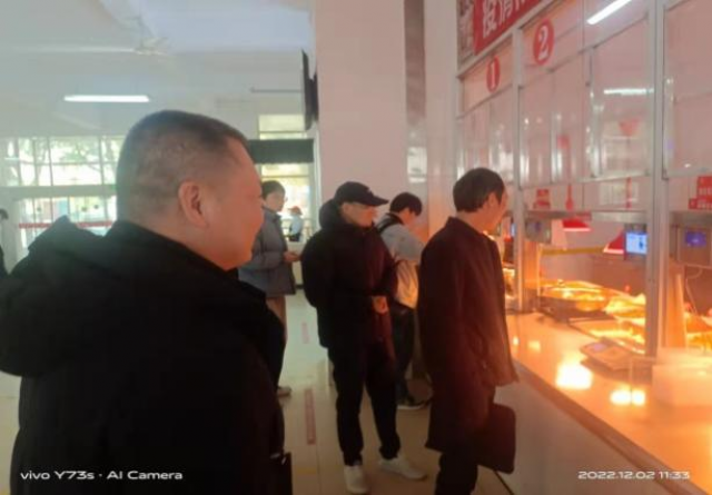 肖建文一行到食堂后厨操作间、检菜间、存储间查看食材初检、浸泡清洗、存储保管及烹饪制作的各项环节,仔细了解食材清洗和烹饪制作的全过程,随后到售卖窗口、教工餐厅查看饭菜品种、品质及价格情况。