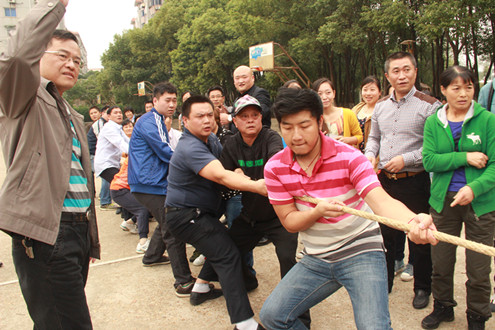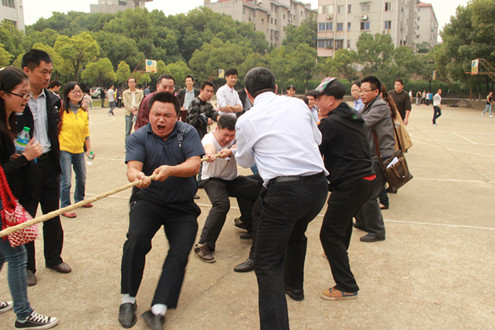 下午两点,四教后篮球场上热闹欢腾,来自校属各单位的教职工们正摩拳擦掌为即将开始的拔河比赛热身。此次比赛采用淘汰制,三局两胜,十余支参赛队伍采用抽签的方式分为A、B两组;我处代表队同金融学院、会计学院等队伍同处B组。